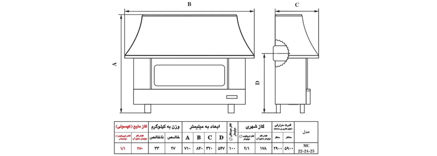 مشخصات بخاری گازی شومینه ای نیک کالا 22000 سیما مدل MC22